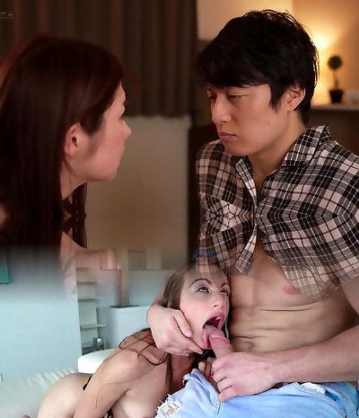 Japanese MILF Fucks on the Bed while Son Watches