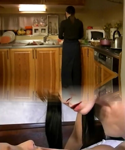 Busty Japanese MILF Gives a Blowjob while Cooking Dinner
