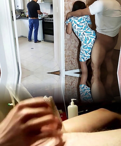 Slutty Wifey Takes Two Cocks Simultaneously While Cuckold Hubby Snacks in Kitchen!